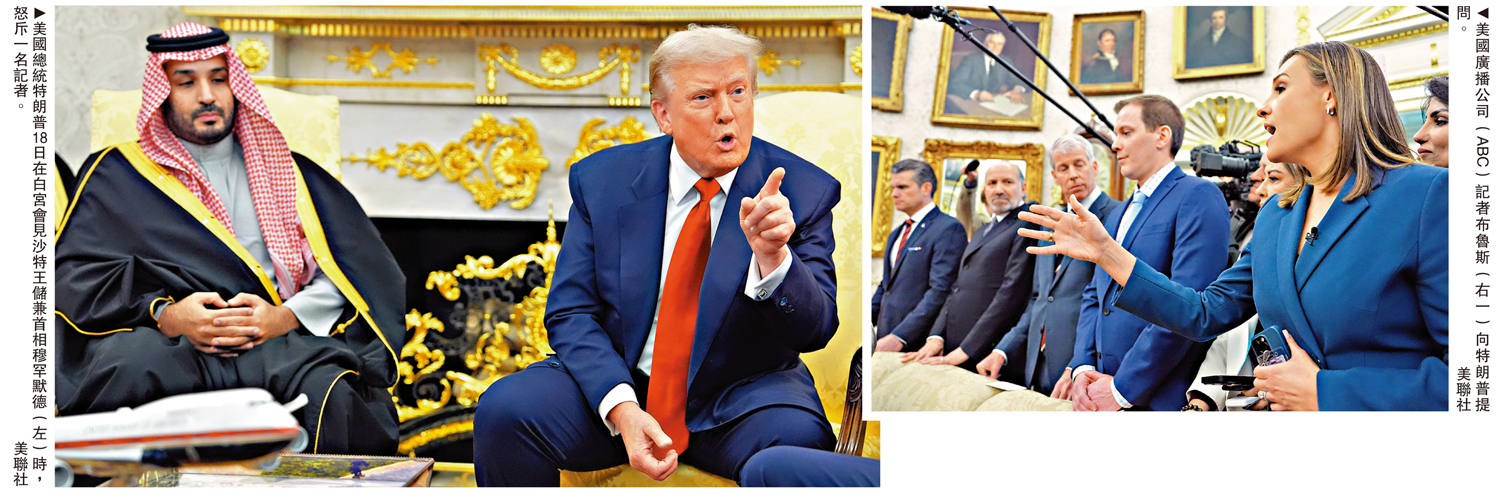 布魯斯還要求公開愛潑斯坦案文件,並問及特朗普家族企業與沙特方面的商業往來可能存在利益衝突,令特朗普多次暴怒,不僅打斷記者提問,還批評ABC是「假新聞」和「業界最糟的媒體之一」,並威脅要吊銷ABC電視台的牌照。