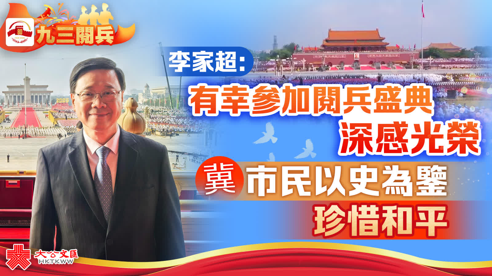 大公文匯全媒體報道,9月3日上午,紀念中國人民抗日戰爭暨世界反法西斯戰爭勝利80周年大會在北京天安門廣場隆重舉行,以盛大閱兵儀式,同世界人民一道紀念這個偉大的日子。行政長官李家超於社交平台發文,表示有幸參加在北京舉行的紀念大會和閱兵盛典,見證國家以最莊嚴的方式紀念勝利,共同銘記歷史、緬懷先烈、珍愛和平、開創未來,深感光榮、自豪和振奮人心。